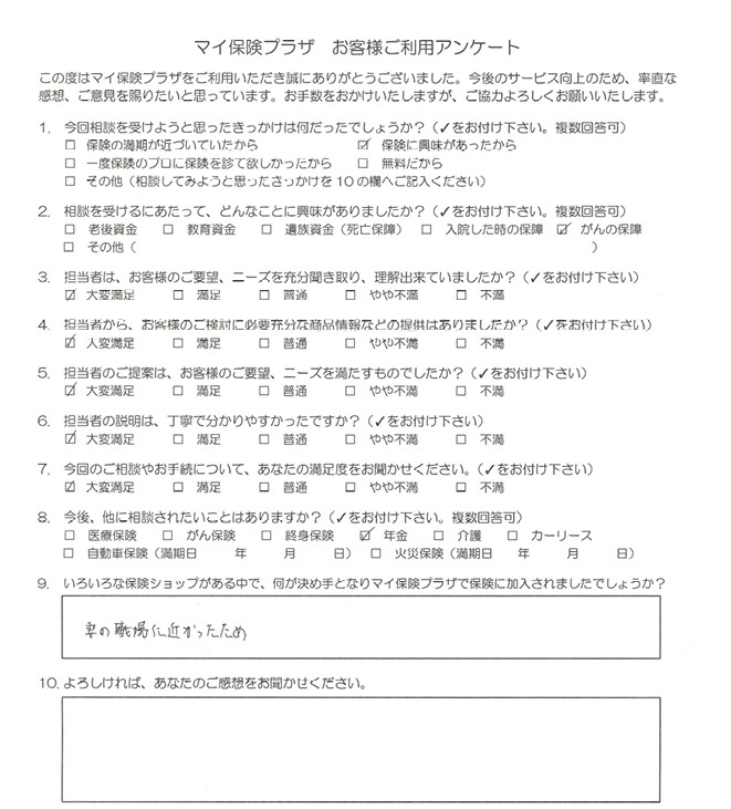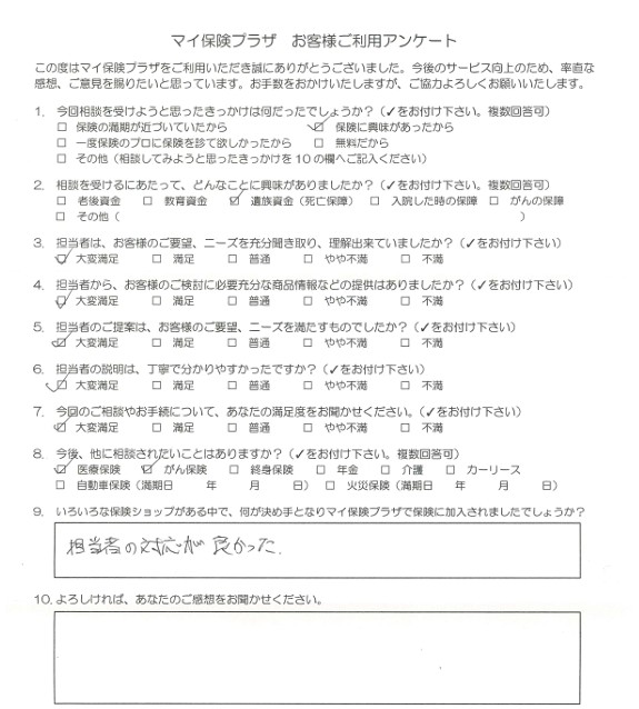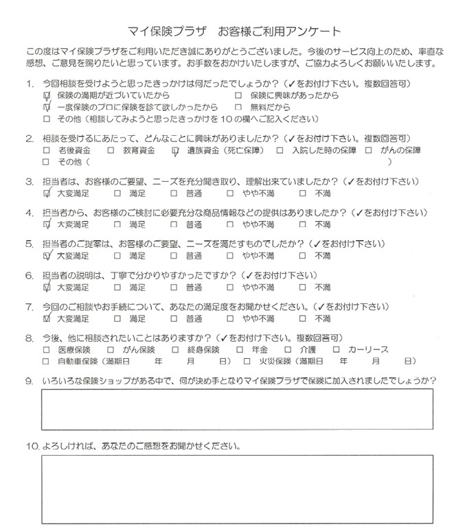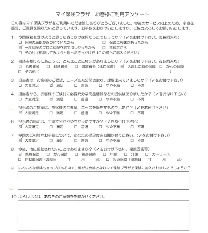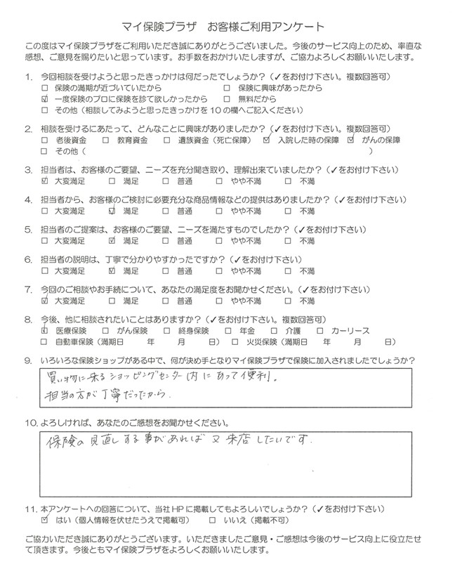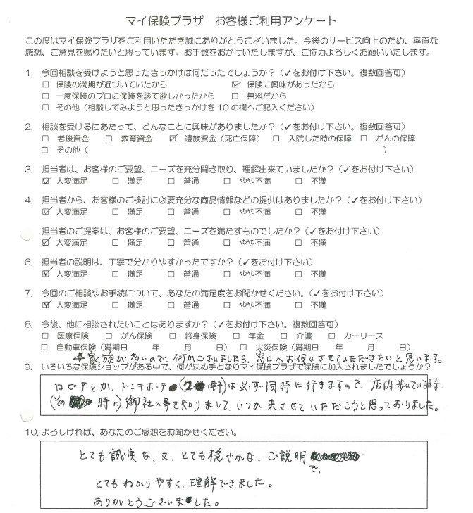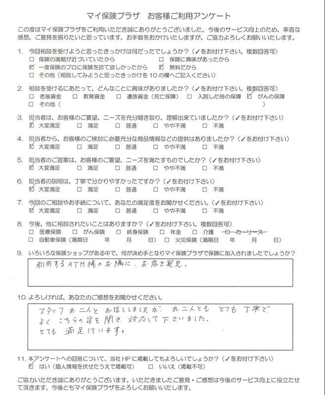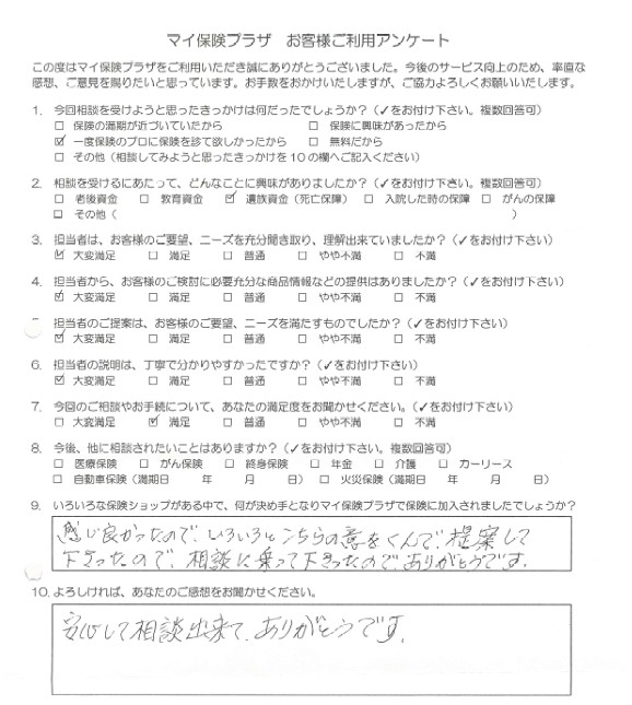 担当者が保険内容の要求(条件)を親身になり、数ある保険から調べて相談してくれました。対応に好感が持て、医療保険・自動車保険・火災保険に入りました。入店しやすい、相談しやすい。今後もよろしくお願い致します。