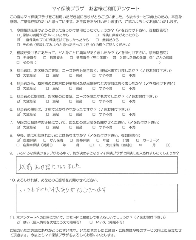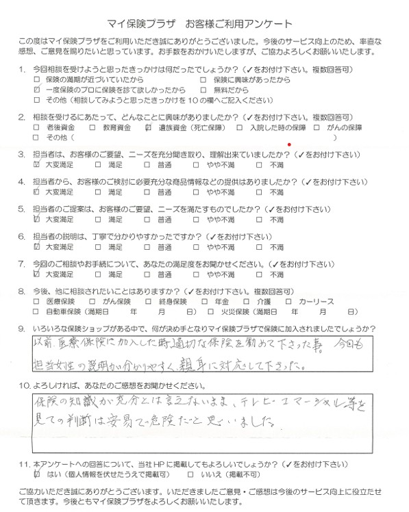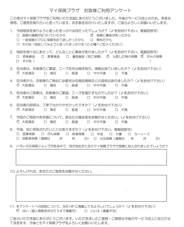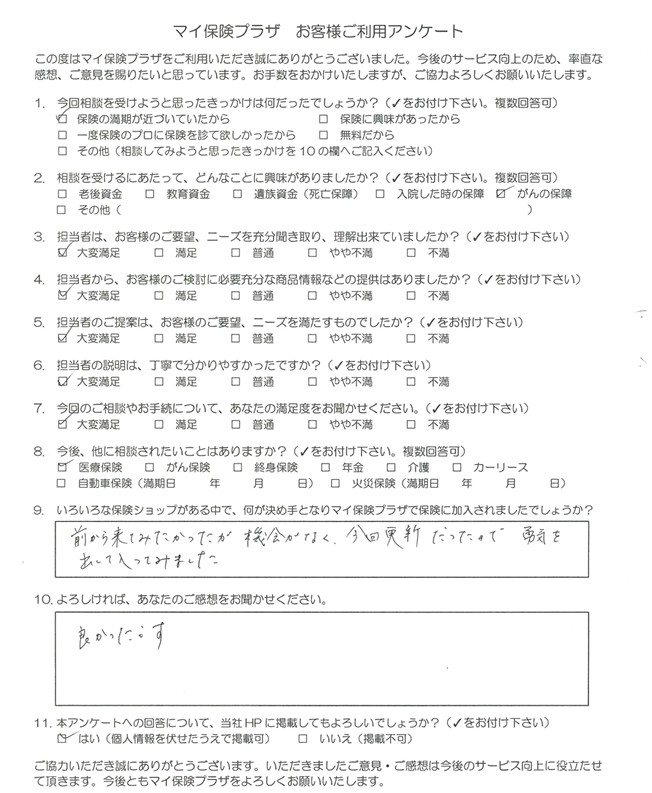 現行の保険と比較し、内容が充実し、なおかつ保険料もさがったので満足しています。