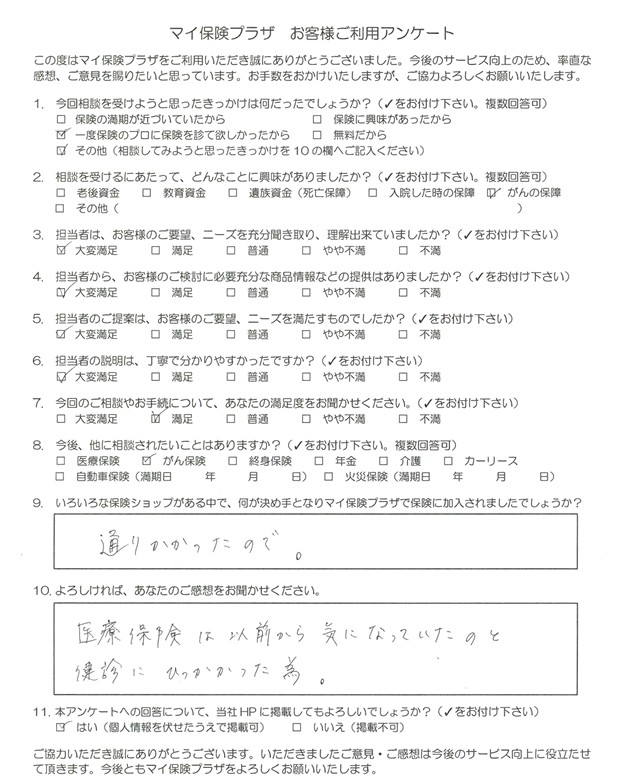 相談しようとしたきっかけは、銀行から医療保険の誘いがあった為比べてみることが必要と思い担当者に見て頂いた。銀行よりも安価で、現在加入中の保険を補える良い提案をして下さった。窓口での対応も良かった。